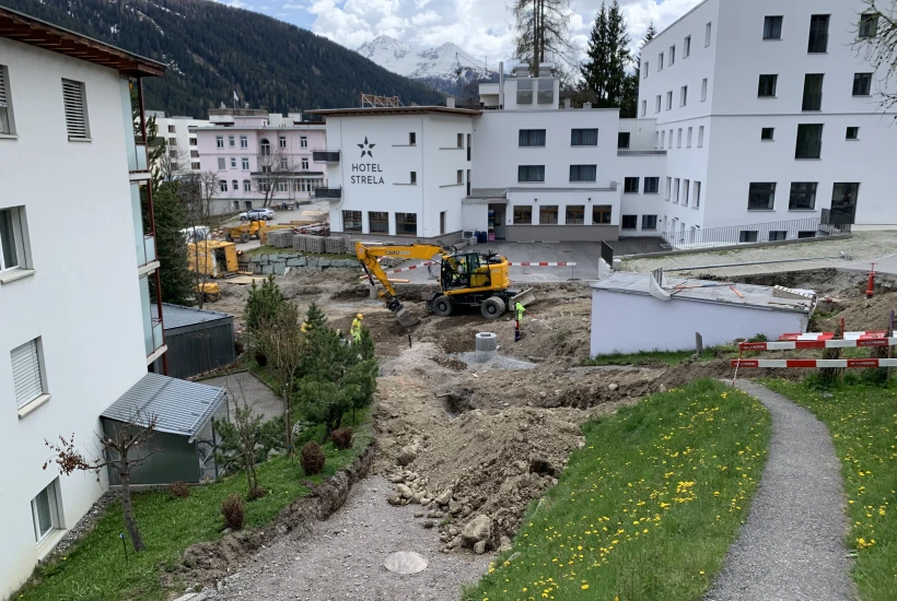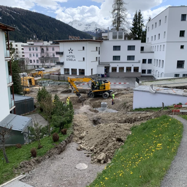 Durch eine gezielte Terrainoptimierung konnten die Schatzalp- und Strelastrasse oberhalb des bestehenden Knotens miteinander verbunden werden. Dadurch münden diese nun in eine übersichtliche und gut befahrbare Kreuzung an der Oberen Strasse. Im Zuge dieser Arbeiten wurde eine unterirdische Abfallsammelstelle in den neuen Kreuzungsbereich integriert, um die Abfallentsorgung effizienter zu gestalten.